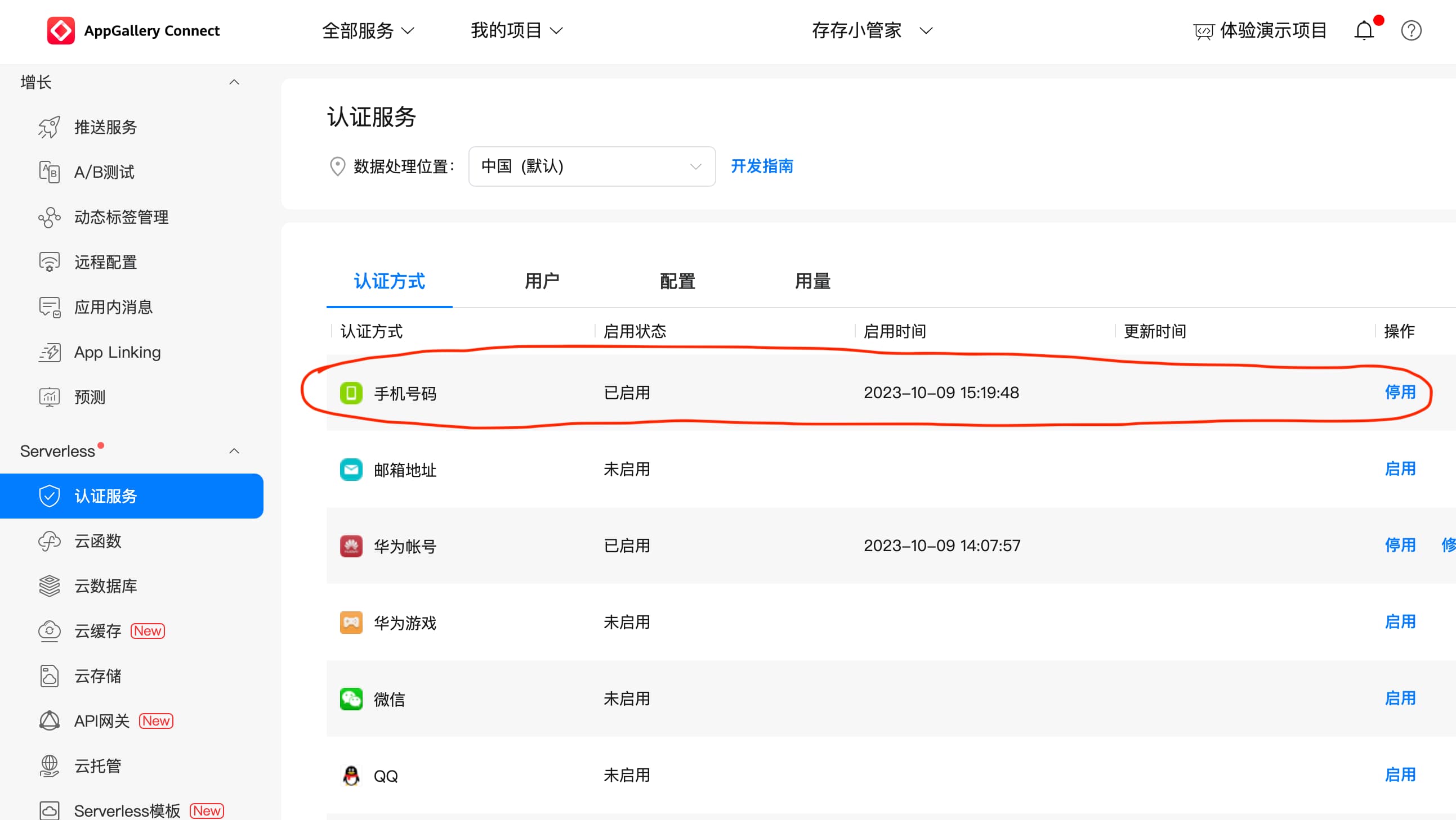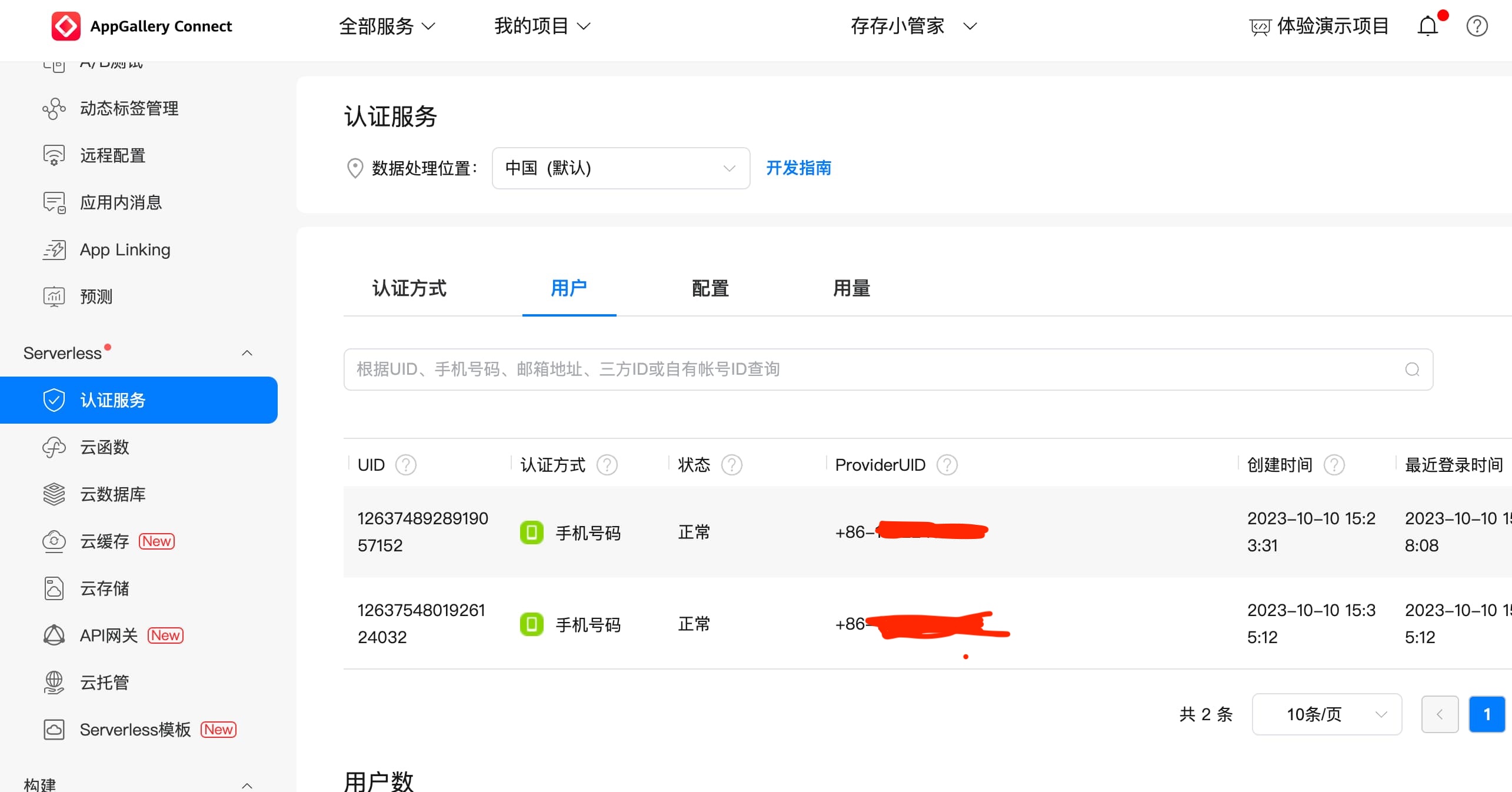 }最后最后还有个比较好的功能就是谁发过短信注册过用户在AppGallery Connect都能够查看到。