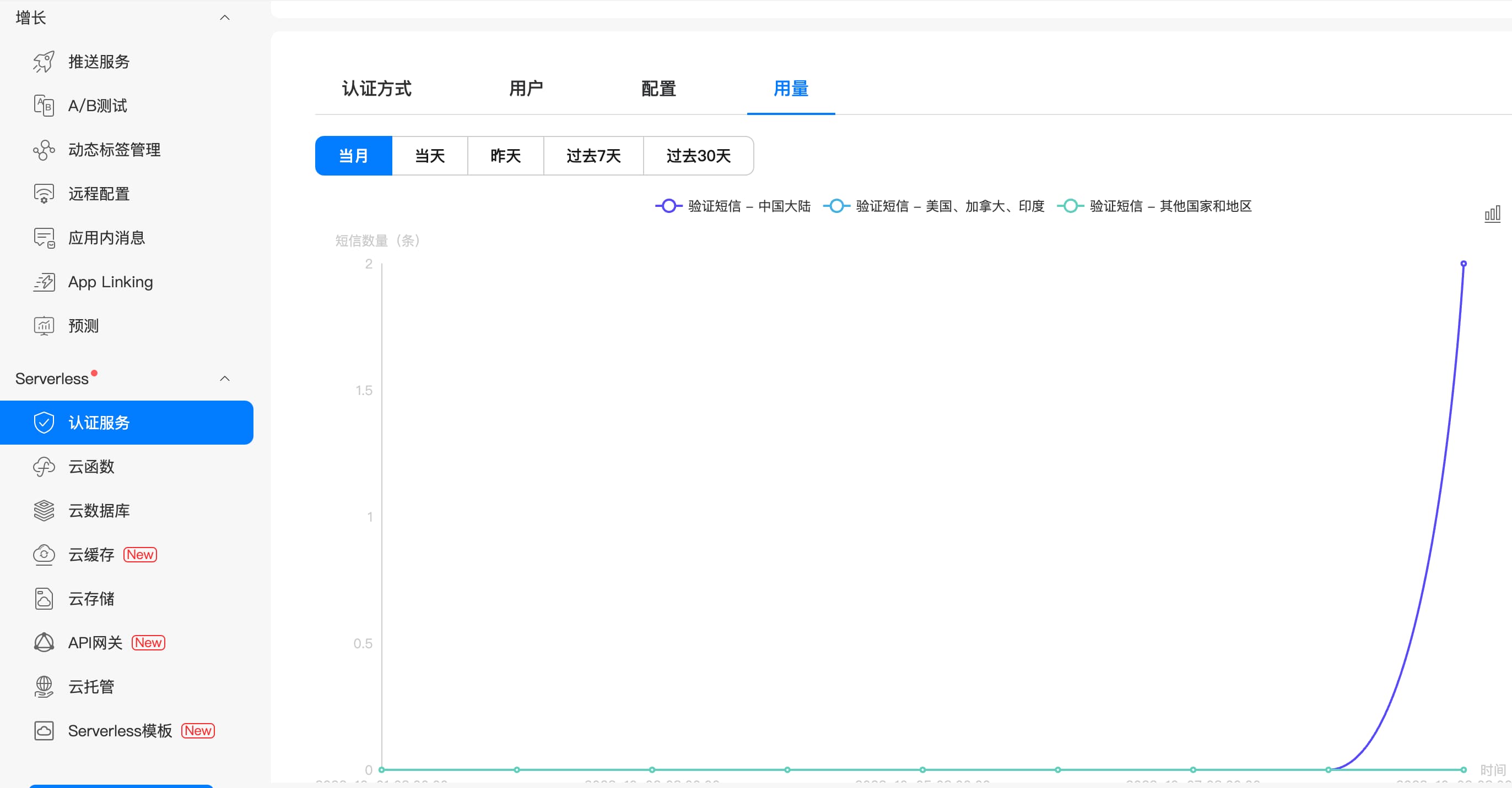 开局送了1000条短信每月,简直不要太爽,微信小程序的配额一共免费1000条,而且那个还不一定会发验证码,相比于这个就良心多了。 在认证的用量能看到短信的发送次数。