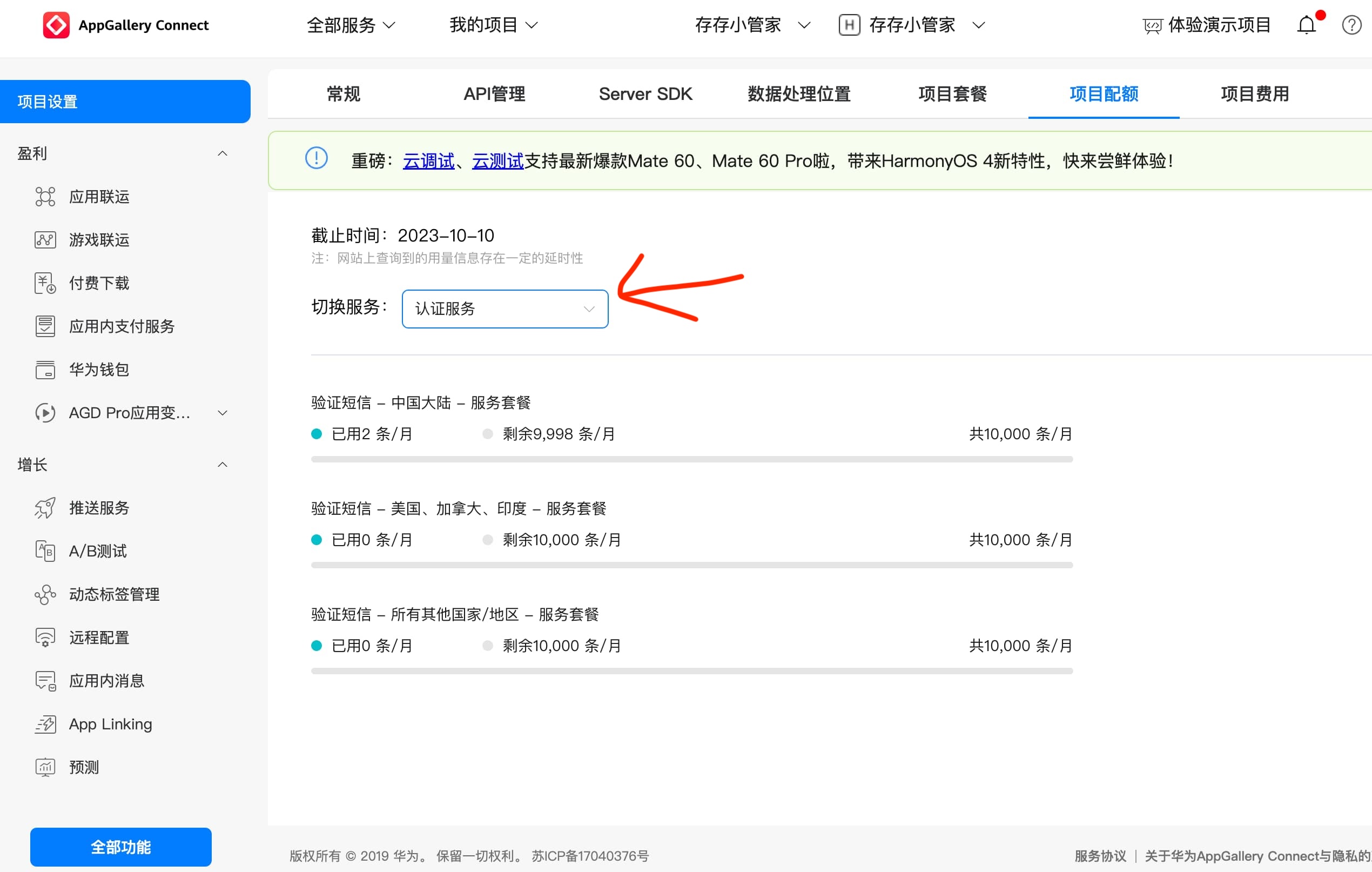在项目设置的项目配额里边,改成查看认证服务能够看到短信的配额用多少了。