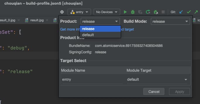 然后点一下在DevEco里边中间的那个小把子。就多出了一个release,然后把build mode改成release。