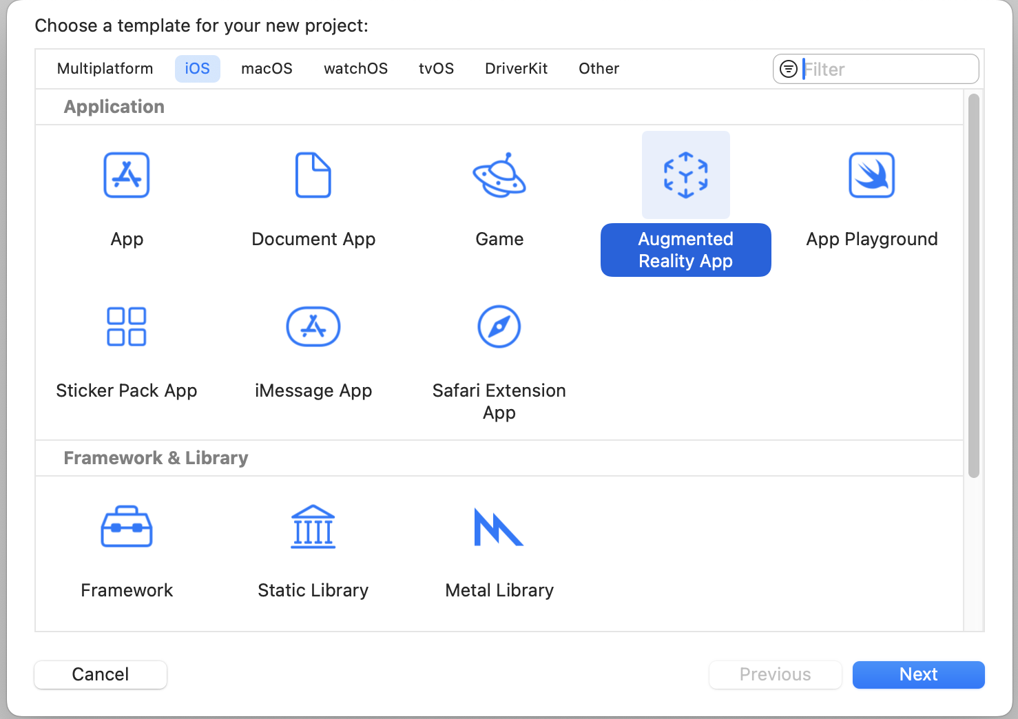 新建一个空项目,项目一定要选择 Augmented Reality App,能够省很多的事。